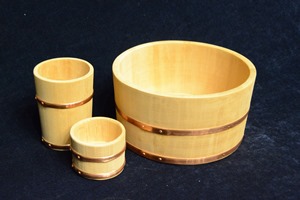 古くは、桶はヒノキの薄板を曲げて桜や樺の皮で閉じ底をつけた曲物でした。現在のように細長い板を円筒形に並べてタガで締め、底板を入れた構造になったのは、室町時代から。桶に蓋をつけたのが樽です。生活の器として受け継がれてきた香川の桶樽は、主に桜の木で作られ、現在も、寿司桶・御櫃・杓などが、多くの人に愛用されています。