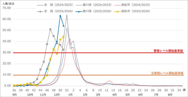 香川県では、令和7年第48週(令和7年11月24日~30日)にインフルエンザ患者の1定点医療機関当たりの患者報告数が33.10人(高松市 33.54人)となり、流行警報基準値である1定点医療機関当たり30人を上回ったことから、インフルエンザ流行警報が発令されました。