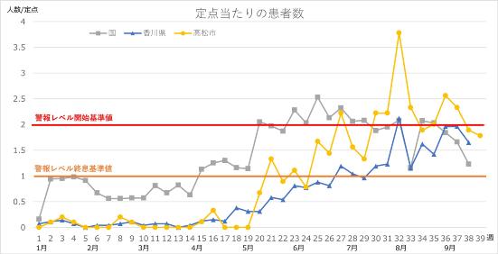 高松市でも、5月頃から報告数が増加し、現在も定点当たりの患者数が3.78人と警報レベルを超えています。