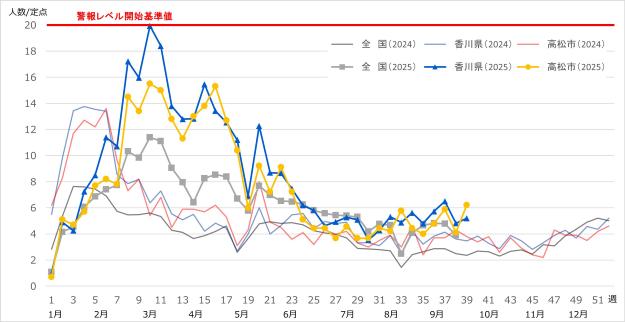 香川県では、ノロウイルス等による感染性胃腸炎が、第10週(2025年3月3日~3月9日)には、1定点医療機関当たりの患者数が19.93人(高松市 15.50人)になりました。以降も、2024年の同時期と比較して高い水準で推移しています。