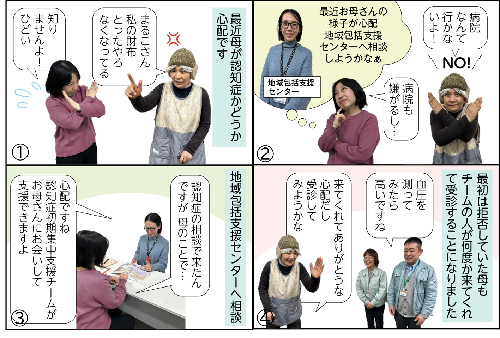 地域包括支援センターでは、高齢者の総合相談窓口として認知症に関する相談を受け付けており、必要な場合には、認知症の知識を持つ専門職で構成された「認知症初期集中チーム」が認知症の本人や家族を訪問してサポートします。