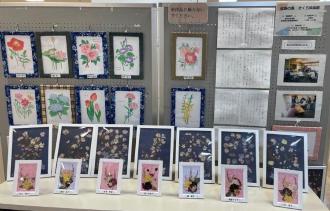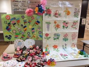 そこで、活動中の写真や活動の中で作成した作品の展示を行います。貼り絵や切り絵、多数の小物作品など、どれも力作ばかりです。