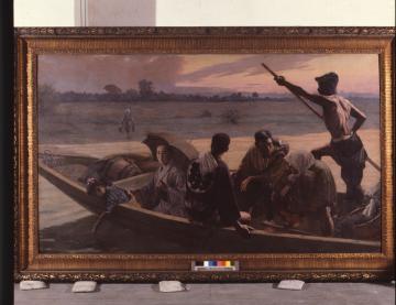 本作品は、実際に大工を呼んで舟の形を拵え、背景となる風景を求めて取手や二子玉川等へ写生に訪れるなど、その画業の中でも力を入れて描いたものである。明治後期の洋画界においては、風景画に人物群を配置して抽象的な概念をあらわすことが課題であったが、本作品では乗合船に乗る様々な人物を描き、多様な性格・境遇の人が乗り合わせる「人事趣味」を表現する。入念な描き込みがみられる画面づくりや色彩の工夫など、日本の初期洋画にあたる写実性と、黒田清輝によって日本にもたらされた外光表現を融合させ、新たな表現として制作した画期的な作品である。