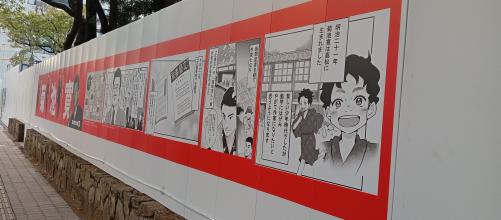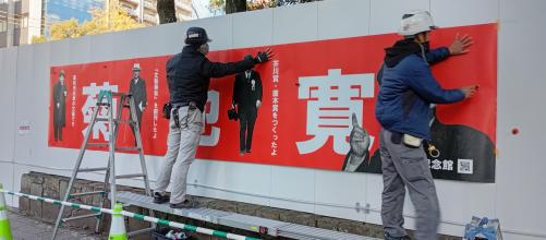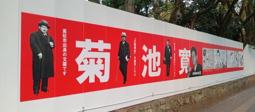 場所は公園南側(菊池寛通り沿い)、縦約1.2メートル、横約12メートルの大きなシートに、菊池寛の写真や漫画、ゆかりの地マップが掲載されています。