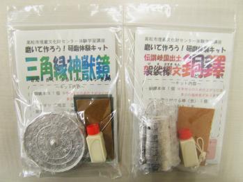 研磨体験キット(銅鐸・三角縁神獣鏡)をご自宅へお送りします。銅鐸は「伝讃岐国出土袈裟襷文銅鐸」、三角縁神獣鏡は「伝香川県出土三角縁銘帯二神二獣鏡」をモデルにしており、細かい文様や文字がはっきり確認できます。キットに貼りつけされたQRコードからYoutubeの解説動画が視聴できますので、解説に従って研磨体験にチャレンジしてみましょう。