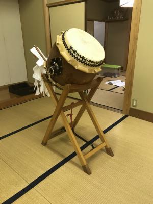 太鼓は3張で直径38cm、胴長48cmで、高さ85cmの台に載せ、竹のバチ(長さ80cm)で、ユタンは絹生地(赤地)、トモエ柄。