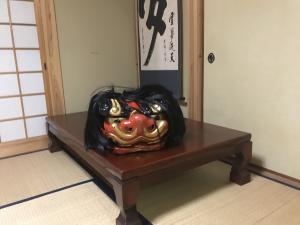 頭は張子の漆塗り(赤)、毛は黒である。ユタンは絹生地で、赤地に巴の紋を描いている。