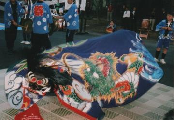 頭は黒毛獅子(ネコ獅子)、ユタンは絹、紫地に虎と龍を描いている。長さ4.4m、幅2.4m。
