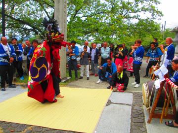 舞は、「登、洞、地、芸飛、寝る、(寝返り2回)、芸飛、地、登、芸飛、地、登」の順で、12~13分。一人獅子があり、舞は3分。毎度二人獅子とセットで舞う。