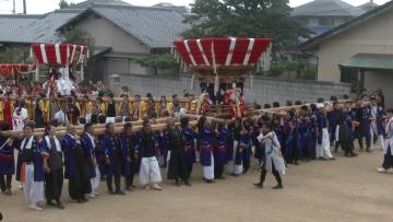 当日は、午前大太鼓台、小太鼓台共に台車にて順廻し11時ごろ宮入りする。13時45分頃から各太鼓台に与えられた順番に応じて担ぐ。