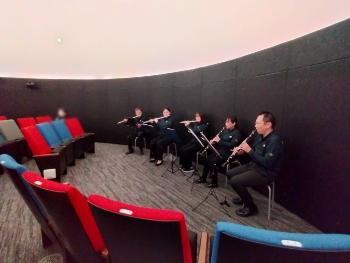 まず、プラネタリウムの投影室に入ると少し狭く感じましたが、天井が高くドーム状になっており、投影が始まると狭さも全く感じなくなりました。さらに、クラリネットとフルートの美しい音色と、生演奏にあわせて次々と映し出される満点の星空に、心が洗われるような穏やかな気持ちになりました。