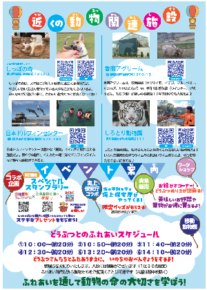 (スケジュールはチラシ記載のとおり。整理券を配布しますので、動物ふれあいを御希望の場合は、受付までお越しください。(1回30名限定。))