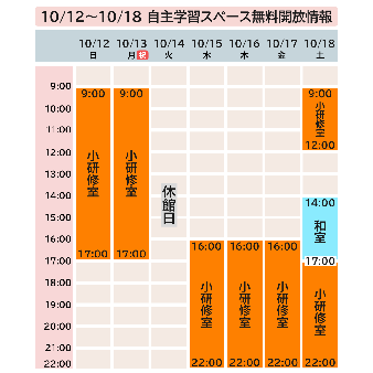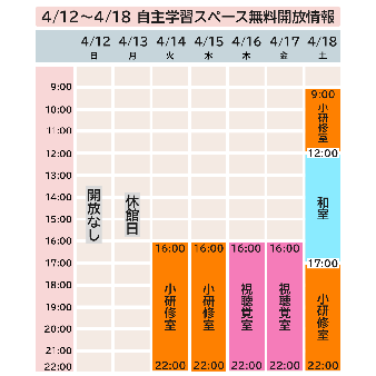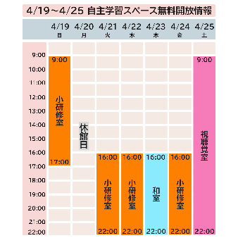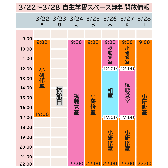 予約等の入っていない部屋を無料で開放しますので、日によってご利用いただける時間が異なります。