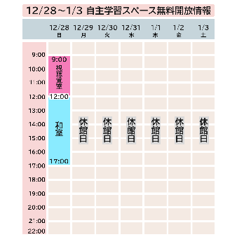 12月29日(月)~1月3日(土)の間、休館いたします。
