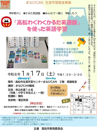 | 内容 | 子どもたちの、ふるさとを愛する心があふれる「高松わくわくかるた」。その英語版を使って簡単な英語を学びます。高松市に来たばかりの人も、長~く住んでいる人も、皆さん一緒に楽しんでみませんか?終わりに、グループに分かれて英語の音声を使ったかるた大会をします。 |