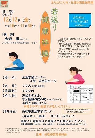 内容 | 簡単な運動や体幹運動、腹式呼吸を使って若返ってみませんか?楽しく運動することで心も体もピッカピカ!!中国武術世界チャンピオンの先生が楽しく指導してくれます。 |
