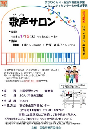 | 内容 | 唱歌や青春の歌など・・・大好きな歌を一緒に歌いましょう!楽器などを鳴らして、気分もリフレッシュ!!歌いたい曲がありましたら、お申込みの時に、一緒にリクエストして下さい。リクエストの曲の受付は12月14日(日曜日)まで。 |