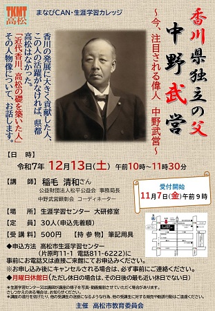 内容 | 香川の発展に大きく貢献した人、この人の活躍がなければ、県都高松はなかった。「近代香川、高松の礎を築いた人」その人物像について、お話します。 |