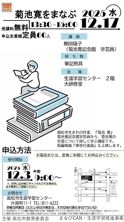 | 内容 | 高松市生まれの作家、『菊池 寛』。菊池寛記念館学芸員から、菊池寛の生涯について詳しく学ぶ講座です。 |