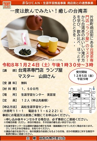 | 内容 | 一度は飲んでみたい台湾茶。片原町商店街にある台湾茶専門店「ランプ屋」のマスターから台湾茶のおいしい淹れ方を学び、飲み比べ、ほっとするひとときを・・・ |
