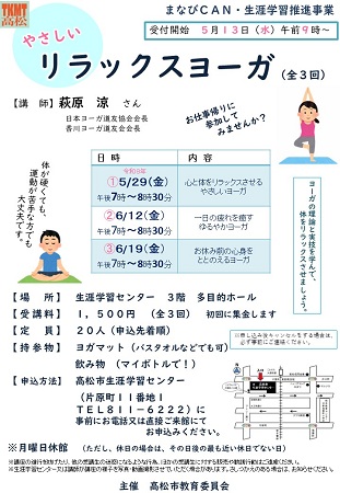 | 内容 | ヨーガの理論と実技を学んで、体をリラックスさせましょう。 (1)心と体をリラックスさせるやさしいヨーガ(2)一日の疲れを癒すゆるやかヨーガ(3)お休み前の心身をととのえるヨーガ |