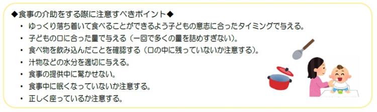 子どもの月齢に関わらず、誤嚥や窒息しないように見守り、食事の介助をしましょう。