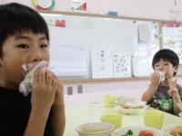 給食のおこわをラップで包んで、おにぎりを作ったよ♪★☆彡