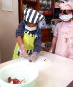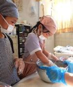 年長児の当番がお米を研いだり、みそ汁の具を切ったりしています。