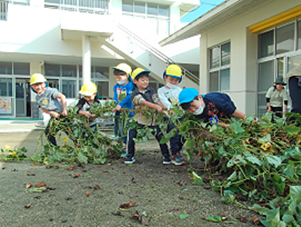 本園では、園外保育を通して地域の自然に触れる経験や、花や野菜の栽培、メダカや金魚等の飼育を通して、自然への興味・関心を広げ、豊かな感性を育んでいます。また、園で収穫した野菜や果物をおやつにして食べたり、カレーパーティーをしたりして、食育も大切にしています。