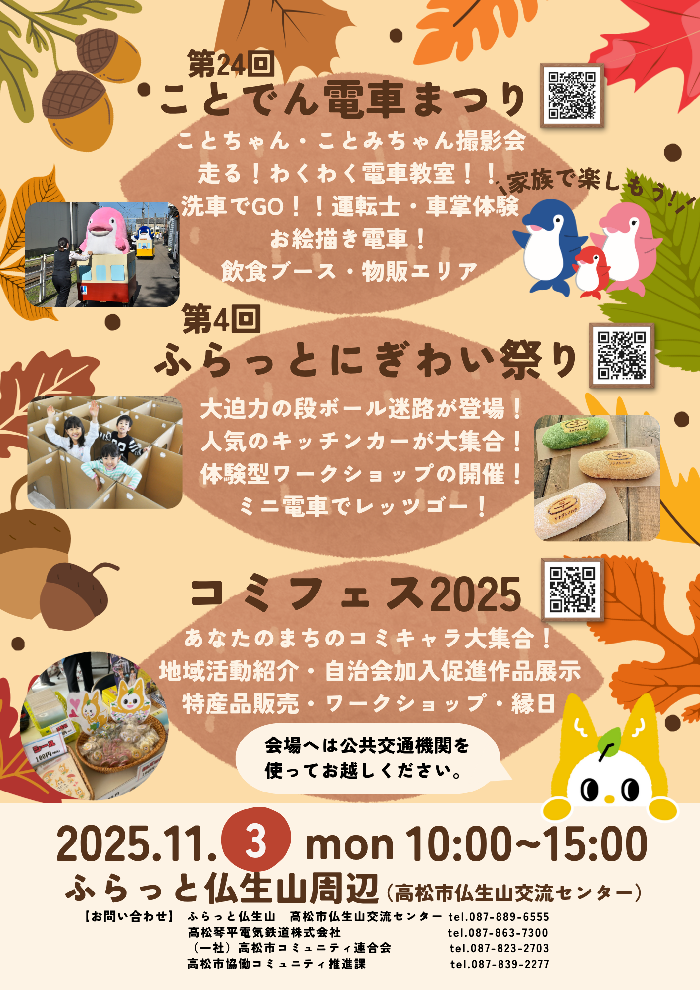 「第4回ふらっとにぎわい祭り」では、キッチンカーやオリジナルお土産が作れるワークショップ、ダンスパフォーマンスなどが行われるほか、「第24回ことでん電車まつり」では、ことちゃん・ことみちゃんの撮影会や運転士・車掌体験などのイベントが行われます。