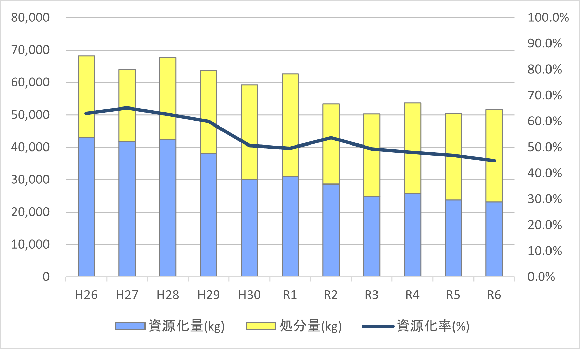 令和6年度は、令和5年度と比べると総排出量・処分量が共に増加しており、資源化率の伸び悩みが大きな課題となっています。