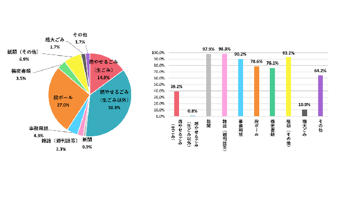 紙類の排出量は全体の44.9%であり、資源化率は平均して83.1%と高水準となっています。一方、燃やせるごみについては、排出量が全体の約半数を占めていますが、資源化率が生ごみ約4割と増加傾向にあり、生ごみ以外は1割弱で昨年と同水準になっています。