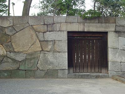 大手桝形内の北面には、石垣をトンネル状に構築した埋門(うずみもん)と呼ばれる小さい門があります。扉は現存していませんが、門柱などは江戸時代のものと考えられます。門柱には小さい穴が無数にあり、鉄板を張っていたと考えられます。
