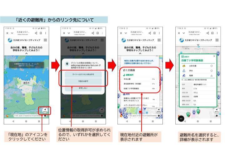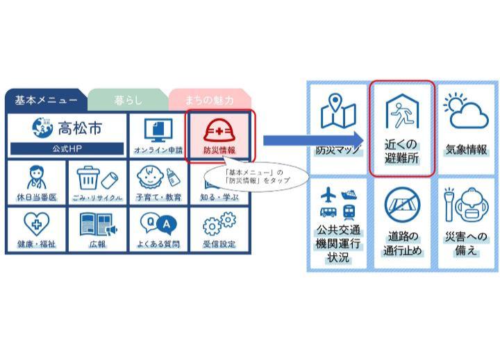 高松市公式LINE「たかまつホッとLINE」と「たかまつマイセーフティマップが連携し、位置情報を使用して、現在地から一番近い避難所を調べることができます。