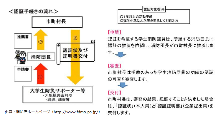 学業の傍ら地域防災の中核をなす消防団員として活動し、地域貢献に努めた学生消防団員に対して証明書を交付しております。採用にあたり、認証証明書の提出があった際には、積極的に評価くださいますようお願いいたします。