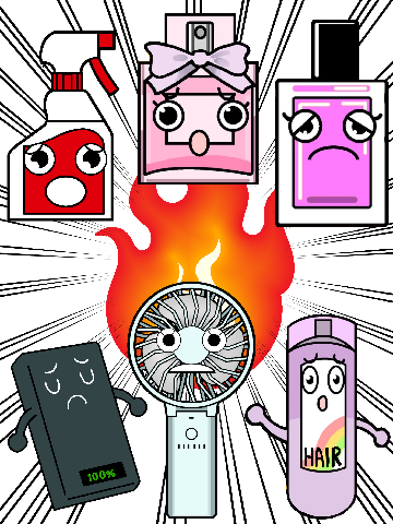 スプレー缶、モバイルバッテリー、マニキュア、携帯用扇風機(ハンディファン)、アルコールスプレー等にも危険物が入っている場合があります!