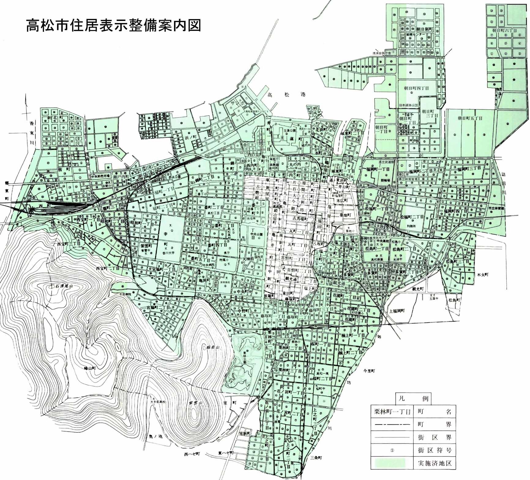 高松市では、当初から、自治省から同法施行実験都市の指定を受け、昭和39年から事業を実施しています。現在の住居表示実施地区の面積は、約11平方キロメートルになります。