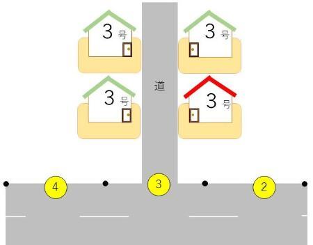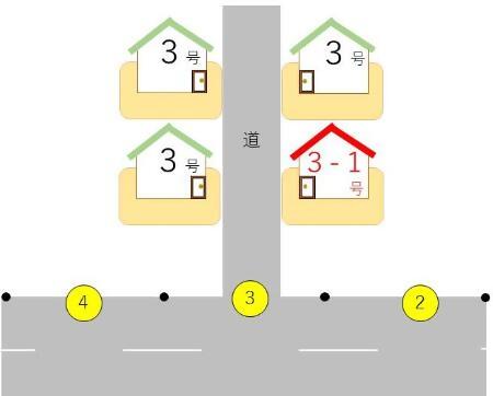 右図のように、同一の進入路をもつ住宅は同じ住居番号となり、重複した住所が複数存在しています。