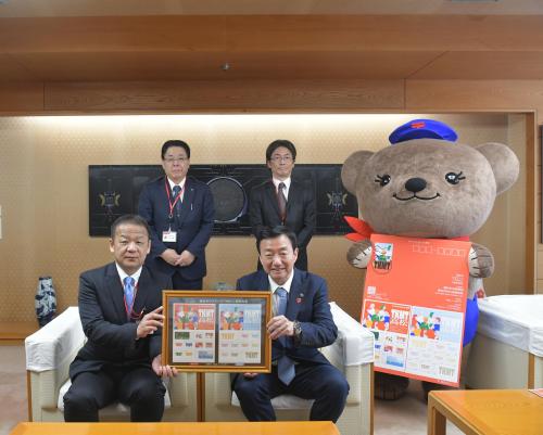 令和8(2026)年2月24日(火曜日)に日本郵便株式会社 高松中央郵便局の久山局長から大西市長へ、オリジナルフレーム切手が贈呈されました。