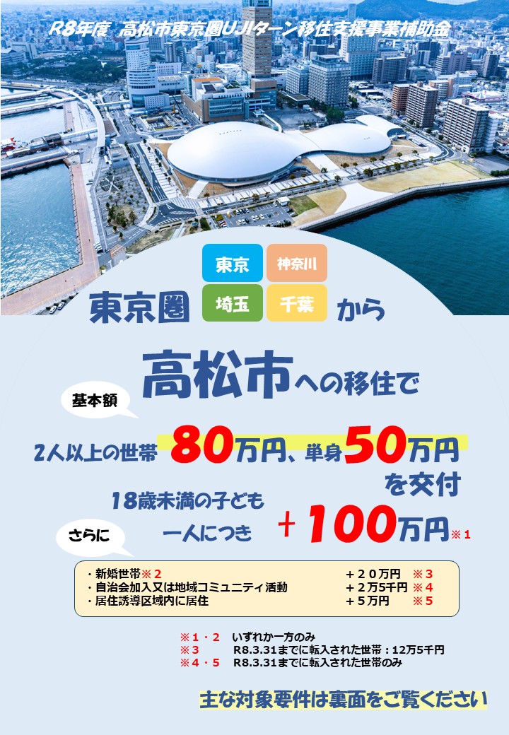 令和8年度の高松市東京圏UJIターン移住支援補助金は、 予算上限に達したため、受付を終了しました。