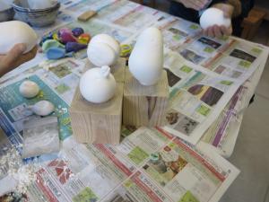 風船に流し込んだ石膏を“むにっ” “ぎゅっ”として、思い思いの形に変えていきます✨