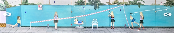 コケシスキー(香川県高松市生まれ)は、どこか既視感のある風景に少女が登場する絵画等、時間の重なりをテーマに表現してきました。近年、違う時間の同じ場所を繋ぎ合わせた横長画面の絵画やマップピンを描いた風景で、ウェブ上のマップを思わせるような「ストリートビュー」シリーズを手掛けています。