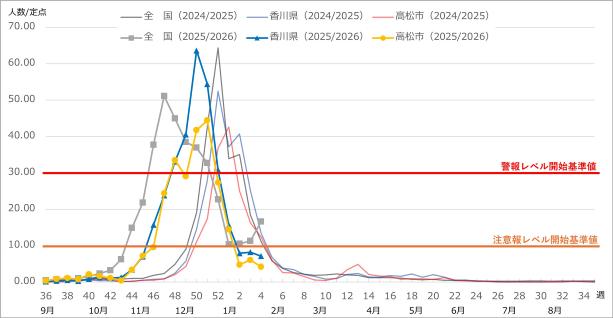 令和8年第2週(令和8年1月5日~11日)に、1定点医療機関当たり7.96人(高松市4.80人)となったため、流行警報は解除になりましたが、社会福祉施設等での集団発生の報告は続いています。