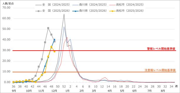 香川県では、令和7年第48週(令和7年11月24日~30日)にインフルエンザ患者の1定点医療機関当たりの患者報告数が33.10人(高松市 33.54人)となり、流行警報基準値である1定点医療機関当たり30人を上回ったことから、インフルエンザ流行警報が発令されました。