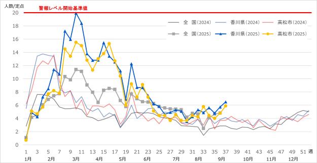 香川県では、ノロウイルス等による感染性胃腸炎が、第10週(2025年3月3日~3月9日)には、1定点医療機関当たりの患者数が19.93人(高松市 15.50人)になりました。以降も、2024年の同時期と比較して高い水準で推移しています。