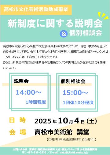 今回の説明会は、高松市で検討している同事業の見直しの方向性を説明し、文化芸術活動に取り組む皆さまからの御意見をいただくとともに、個別に相談できる相談会を実施します。