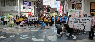 11月4日(火曜日)に丸亀町壱番街前ドーム広場で開催された、児童虐待・DV防止等啓発街頭キャンペーンに参加しました。オープニングセレモニーでは、「世界中のこどもたちが」と「手のひらを太陽に」の2曲を、壱番街ドーム保育園のみなさんの合唱に合わせて演奏しました。この日のために一生懸命練習された元気で可愛い歌声にたくさんの元気をいただきました。