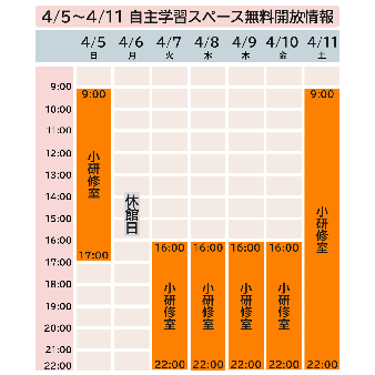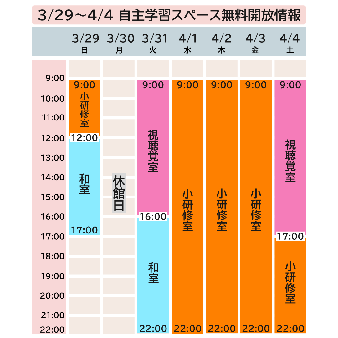 予約等の入っていない部屋を無料で開放しますので、日によってご利用いただける時間が異なります。