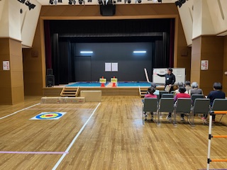 今回は、高松市創造都市推進局スポーツ振興課の職員を講師に迎え「パラスポーツを体験してみよう!」を開催しました。今回は、簡易コートのボッチャ、カローリングの2種目を体験しました。