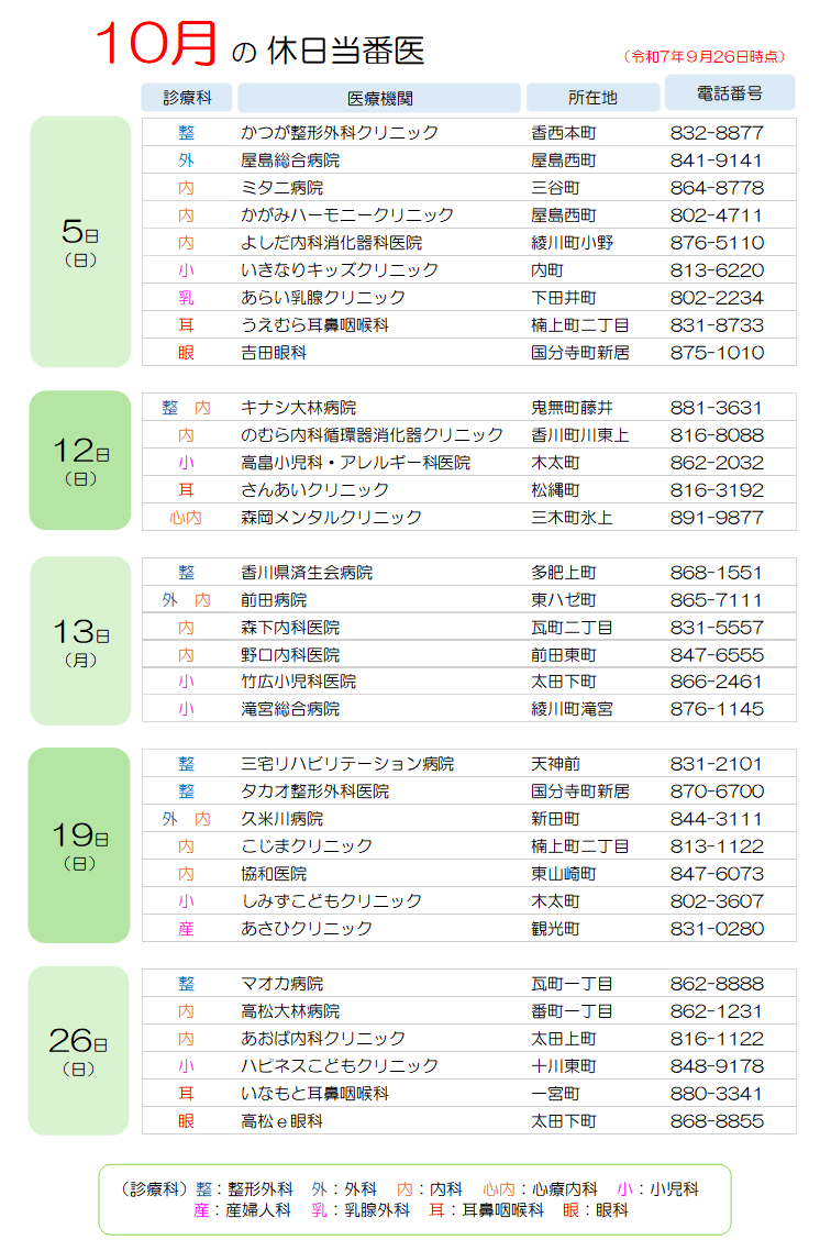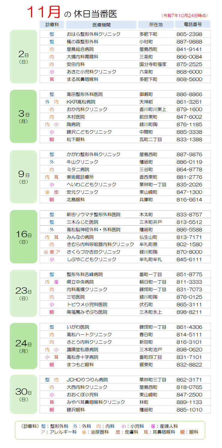 また、当日の新聞(朝刊)、広報たかまつ及び医療情報ネット(ナビイ)でも、当番医の所在地や電話番号等をご確認いただけます。